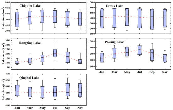 Chiquita Lake, Urmia Lake, and Qinghai Lake also showed seasonal characteristics, although not as prominent as Dongting and Poyang Lake. The maximum value of the water area of Chiquita Lake appeared in May, and the annual change curve showed a single peak shape. The bimonthly variation of the area of Urmia Lake showed a bimodal shape and the peaks of the lake area appeared in May and November, respectively, and the lowest value appeared in September. For Qinghai Lake, the intra-annual variation was completely opposite to that of Urmia Lake, showing a shrinking trend from January to May, expanding to the largest from July to September, and then starting to shrink.