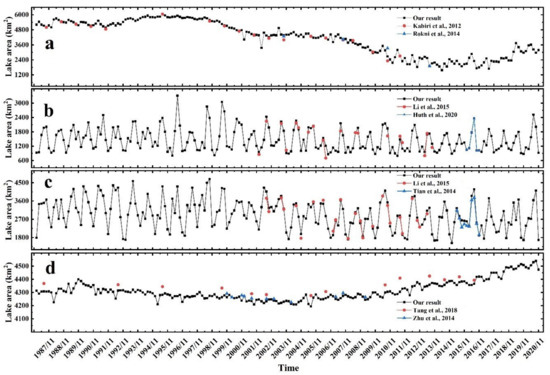 In order to further discuss the effectiveness of the proposed TSIRB method and the obtained BSWD data, we compared the results of this study with those of previous studies and carried out the correlation analysis between the lake area series and the lake water level series of the case lakes. We also discussed the uncertainties of using the TSIRB method to produce lake area sequence in this section.