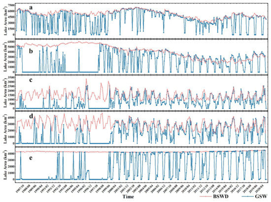 Application tests were carried out on five typical lakes in different parts of the world, and 34-year BSWD products for the case lakes were obtained. The evaluation results of water extraction accuracy show that for different types of lakes in different seasons, the average values of Kappa coefficient and OA were 0.90 and 96.6%, respectively, which shows a relative high level of accuracy. The BSWD products show strong positive correlations with the lake water level sequences (correlation coefficient 0.87~0.95) and show good agreement with the results of other independent studies on single lakes (correlation coefficients 0.93–0.99). Compared with the GSW monthly water body products, the BSWD products improved the void values in the monthly sequence data, show stronger temporal continuity, and can obtain complete and valid lake water sequences.