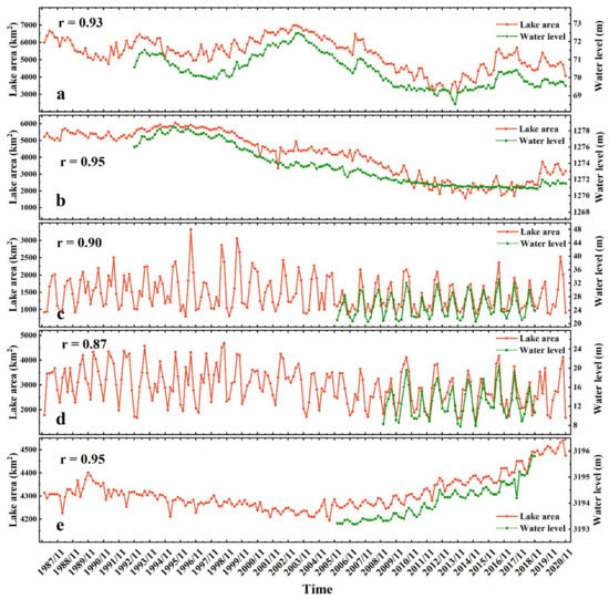 Lake water level series data were used to validate the results of lake area sequences because of the strong correlations between the lake water level and the lake area. In the five case lakes, the water level data came from two different sources. The water level data of Poyang Lake, Dongting Lake, and Qinghai Lake were obtained through site measurements. The data were extracted from the “Hydrology Yearbook of People’s Republic of China”, the time series was 2006–2018, and the time resolution was days. Among them, the water level data for Poyang Lake, Dongting Lake, and Qinghai Lake were measured in Duchang Station, Chenglingji Station, and Xiashe Station, respectively [56,57].