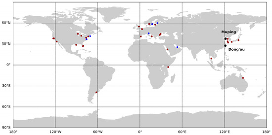 Locations of the initial six AERONET-OC sites (blue dots), expanded twenty-six sites (red dots), and the two fixed platforms, i.e., Muping and Dong’ou (black dots), in the Yellow Sea and East China Sea, respectively.