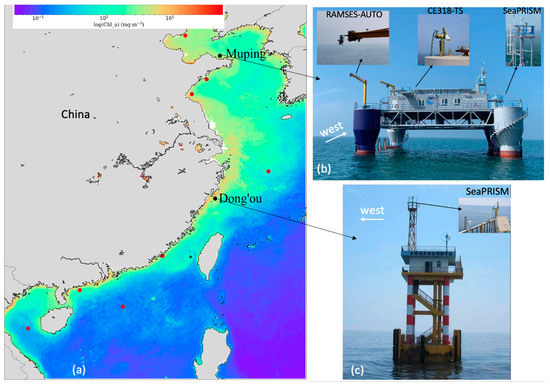 (a) Location of ten AERONET-OC type sites along the China coast. The black dots are the Muping and Dong’ou sites and the red dots are the eight sites under construction. The background is the annual mean chlorophyll concentration derived from MODIS/Aqua in 2021. (b,c) are photographs of platforms at the Muping and Dong’ou sites. The inserts are the instruments (SeaPRISM, CE318-TS, and RAMSES-AUTO) deployed on each platform.