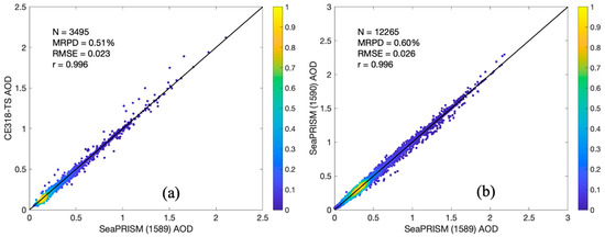 Density scatter plot of aerosol optical depth (AOD) between (a) SeaPRISM (1589) vs. CE318-TS and (b) SeaPRISM (1589) vs. SeaPRISM (1590). Data in (a) were measured before 10 June 2020 and compared at 442, 510, 667, 865, and 1020 nm. Data in (b) were measured after 10 June 2020 and compared at 400, 412, 442, 490, 510, 560, 620, 667, 779, 865, and 1020 nm. The statistic parameters, including the total number of matched measurements (N), median relative percentage difference (MRPD), root mean square error (RMSE), and Pearson correlation coefficient (r), are overlaid.