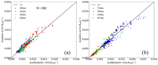 Scatter plots of remote sensing reflectance (Rrs) comparison between the SeaPRISM and RAMSES-AUTO at wavelengths of (a) 400, 412, 442, and 490 nm, and (b) 510, 560, 620 and 667 nm.