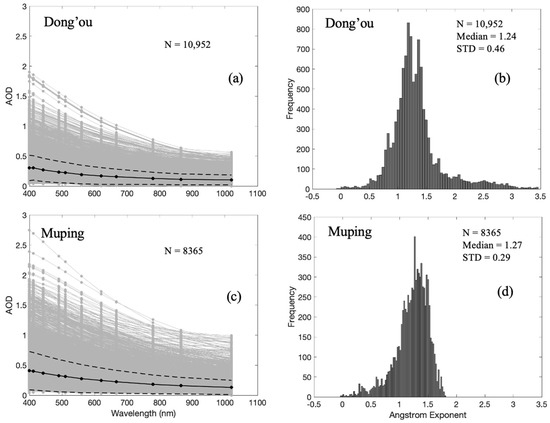 SeaPRISM−measured spectral aerosol optical depth (AOD) at the (a) Dong’ou and (c) Muping sites. The grey lines represent all AOD measurements. The black solid and dash lines are the median and one standard deviation of AOD. (b,d) are the histograms of Ångström Exponent at Dong’ou and Muping sites, respectively.