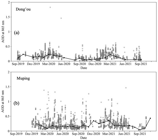 SeaPRISM-measured time-series aerosol optical depth (AOD) at 865 nm at the (a) Dong’ou and (b) Muping sites. The grey dots represent all valid AOD measurements and the black dots are the monthly mean values.