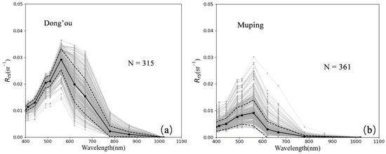 SeaPRISM-measured remote sensing reflectance (Rrs) at the (a) Dong’ou and (b) Muping sites. The grey lines represent all Rrs measurements. The black solid and dashed lines are the median and one standard deviation of Rrs, respectively.