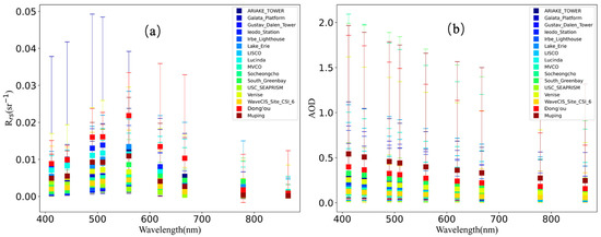 Comparison of mean and standard deviation of (a) Rrs and (b) AOD at 14 AERONET-OC sites, as well as the Dong’ou and Muping sites.