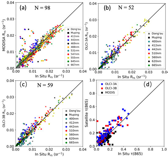 Validation of remote sensing reflectance (Rrs) derived from (a) MODIS/Aqua (MODISA), (b) OLCI/Sentinel-3A (OLCI-3A), (c) OLCI/Sentinel-3B (OLCI-3B) and (d) aerosol optical depth at 865 nm, , with in situ data measured by SeaPRISMs at the Muping and Dong’ou site, respectively.