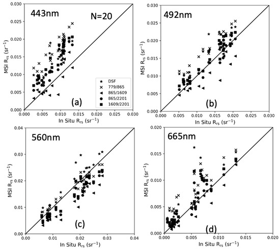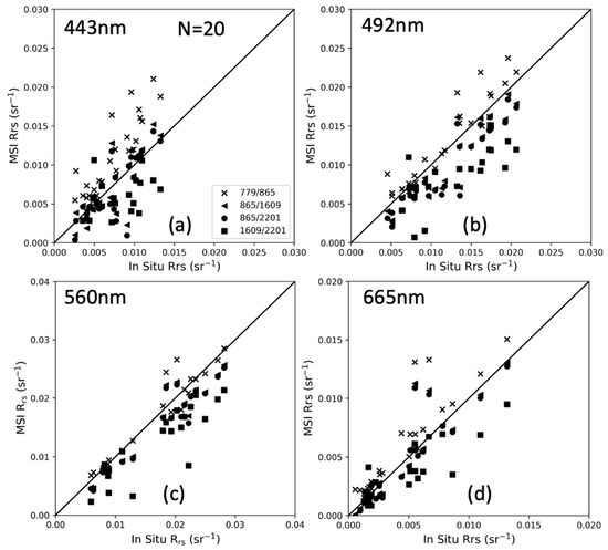 Validation of MSI-derived remote sensing reflectance (Rrs) with in situ measurements at the Dong’ou and Muping sites at (a) 443 nm, (b) 492 nm, (c) 560 nm, and (d) 665 nm. The MSI Level 1C data were processed to Rrs using the SeaDAS with four band combinations (779/865, 865/1609, 865/2201, and 1609/2201).