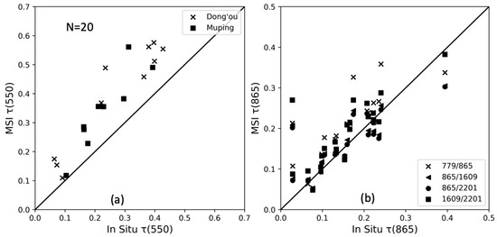 Validation of MSI-derived aerosol optical depth (a) at 550 nm, (550), using ACOLITE and (b) at 865 nm, (865), using SeaDAS with four band combinations (779/865, 865/1609, 865/2201, and 1609/2201).