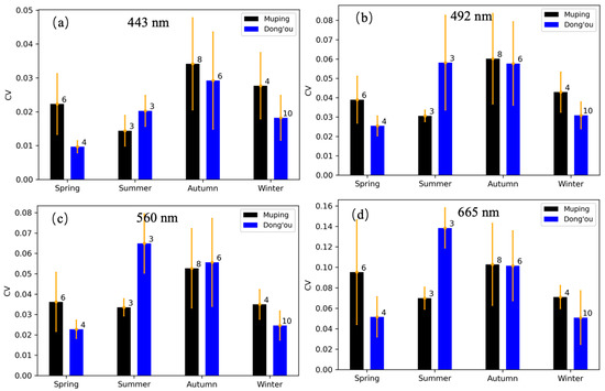 The mean and one standard deviation of coefficient of variation (CV) of remote sensing reflectance (Rrs) at (a) 443, (b) 492, (c) 560, and (d) 665 nm at the Dong’ou (blue bars) and Muping (black bars) sites. The figure on top of the bar indicates the number of images used to compute the mean and standard deviation of CV.
