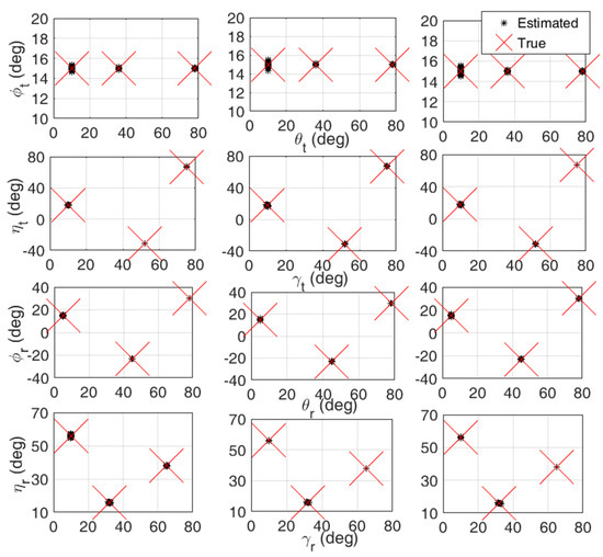Scatter results of the proposed approaches. In Figure 2, we plot the scatter results of the proposed T-TS approach, the T-RS approach, as well as the T-TRS approach for completely coherent targets in Case (I). Herein, we consider complete coherent targets with , , , , , , , and . Moreover, M = 8, N = 12, L = 500, , , and SNR = 0 dB are considered. It is obvious that 2D-DOD, 2D-DOA, 2D-TPA, and 2D-RPA can be accurately estimated by the T-TS, T-RS, and T-TRS approaches, and all the results are correctly paired. It is evident that the proposed approaches are effective for EMVS-MIMO radar, even through the two targets have the same Tx azimuth angle .