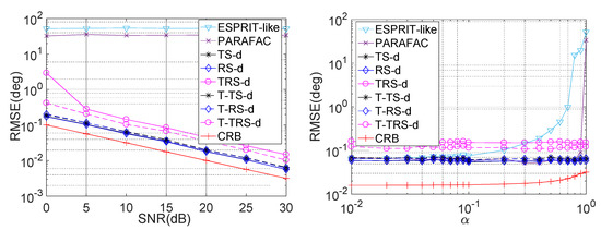 The main complexities of the proposed estimators are the TALS for PARAFAC decomposition. For an PARAFAC tensor with rank-K, the TALS procedure requires , where represents the number of iterations required to achieve convergence. According to (22)–(24), the dimensions of the PARAFAC models associated with the T-TS approach, the T-RS approach, and the T-TRS approach are , , and , respectively. Therefore, the main complexities of the T-TS approach, the T-RS approach, and the T-TRS approach are , , and , respectively. In comparison, the dominant complexity of the TS approach, the RS approach, and the TRS approach in [37] is the eigen decomposition of the covariance matrix. Accordingly, the dominant complexity of the TS approach, the RS approach, and the TRS approach are , , and , respectively. We list the main complexity comparison in Table 1. Notably, the main computational burden of the matrix-based approaches is on the third-order of the dimension of the covariance matrix, while the complexity may be lower in the tensor-based counterparts (since only the second-order of the Tx/Rx scale is involved), especially in the presence of large scale Tx/Rx EMVS array.