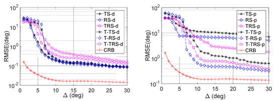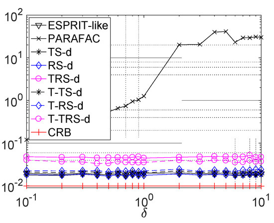 RMSE comparison versus target distance in case (I).Figure 7 illustrates the average RMSE comparison for completely coherent targets in Case (I) with different inter-target distance , where K = 2 complete coherent targets are considered with parameters , , , , , , and . Moreover, for L = 200 and SNR = 10 dB, other conditions are the same as in Example 1. It is observed that the RMSE of all the methods will improved quickly with the increasing when is smaller than ; otherwise the RMSE of all the methods would be improved slowly with the increasing . Since the proposed approaches can take advantage of the tensor nature, they outperform the matrix-based estimators, especially in polarization parameters estimation.