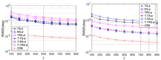 RMSE of the proposed approaches versus SNR.Figure 3 gives the average RMSE on direction (2D-DOD and 2D-DOA) estimation and polarization (2D-TPA and 2D-RPA) estimation versus SNR comparison for completely coherent targets in Case (I), where , and other conditions are the same as in Example I. The average RMSE on direction and polarization are marked with suffixes ‘-d’ and ‘-p’, respectively. It is observed that all the approaches provide improved RMSE with the increasing SNR. Obviously, the TS approach and the RS approach offer more accuate direction estimations than the T-TS approach and the T-RS approach, while the proposed T-TRS approach achieves better estimation accuracy than the TRS approach. Interestingly, all the tensor-aware estimators offer much better polarization estimation accuracy than their matrix counterparts. In addition, it should be noticed that there are gaps between all the mentioned approaches and the CRB, implying that there is room to further improve the estimation accuracy.
