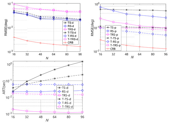 Performance comparisons versus Rx EMVS number N in case (I).Figure 6 illustrates the average RMSE comparison and average running time (ART) comparison for completely coherent targets in Case (I) with different Rx EMVS number N, where M = 12, , , L = 500, and SNR = 10 dB are considered. In such a configuration, the MIMO radar system can be interpreted as a massive MIMO radar since there are 72 Tx components and 6N Rx components. It is shown that the tensor approaches offer a much closer direction estimation performance than the matrix approaches, and they outperform the matrix counterparts with respect to polarization parameter estimation. As expected, the T-TS approach is much more efficient than the TS approach, especially in the presence of large N. However, since M is relatively small, the T-RS approach and the T-TRS approach would require more calculation time than the RS approach and the TRS approach, respectively. In sum, there is a trade-off between running time and the estimation accuracy. In practice, the approprite algorithm should be chosen to balance the two indices.