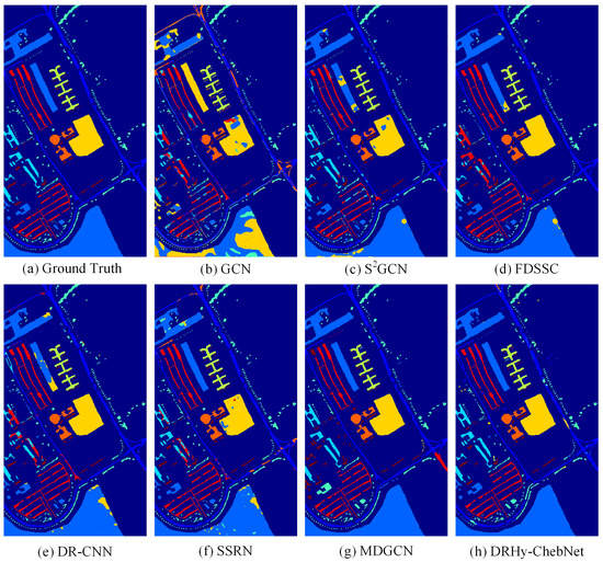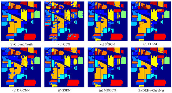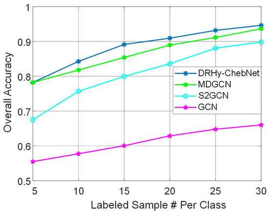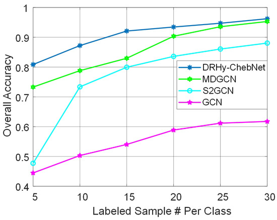As can be seen, the proposed DRHy-ChebyNet had the best performance for all numbers of labeled data except for the worst case, i.e., when the number of labeled samples was down to 5, where it had comparable performance with the MDGCN. When the number of labeled samples per class grew to 10, the proposed method had a giant step of improvement, realizing good classification accuracy. The GCN and method do not use the superpixel to cluster local pixels, and thus their performance is not as good as the other superpixel-based methods when lacking labeled samples.