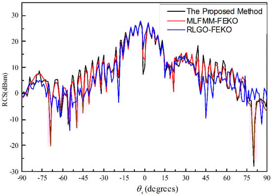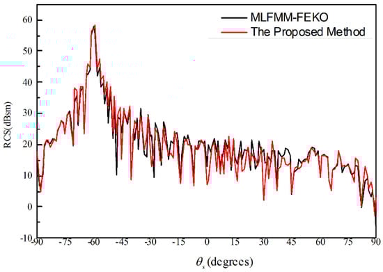 As shown in Figure 3, a good agreement has been achieved between the proposed hybrid method and MLFMM solver in commercial software FEKO. Meanwhile, compared with the RL-GO solver in FEKO, the result is more accurate when and . The root mean squared error (RMSE) between the results calculated by the proposed method and RL-GO solver and MLFMM solver is given in Table 1. The RMSE of the proposed method is much smaller than of the RL-GO solver, which means the proposed method is more accurate than the RL-GO solver in commercial software. Although it reduces CPU running time compared with the MLFMM solver, it is much larger than the RL-GO solver based on high-frequency approximation algorithm. It can be concluded that the proposed method has qualities in improving the accuracy of the high-frequency method and reducing the CPU time.