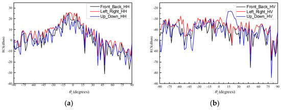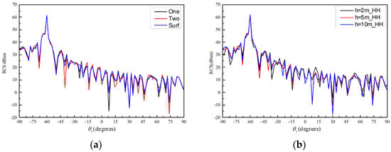 Figure 7b presents the bistatic scattering results from two missile-like targets above the electrically large rough sea surface at the heights of , and . It can be seen that as the target height increases, the coupling scattering between the target and the rough sea surface decreased, however, the numerical change is not obvious. The aforementioned examples not only prove the accuracy of the algorithm, but also analyze the shortcomings of EM scattering analysis and problems faced in the target detection and recognition field.