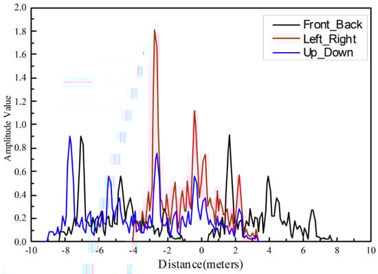 The location distribution of two missile-like targets have been shown in Figure 5. Utilizing the proposed IPO and two-scale model method to obtain the echo of the targets, then the 1-dimensional distance image can be obtained through a fast Fourier transform. The incident angle is and the azimuth angle is . It can be seen in Figure 8 that the length of the target is about (in radar LOS), and there are three main scatter centers that correspond to three main parts of the target including the nose-corn, wings, and empennage. When the two missile-like targets are at the same height above the rough sea surface and parallel to each other, the distance in radar LOS is the same; therefore, the scatter centers are in the same position, but the amplitude value increases.