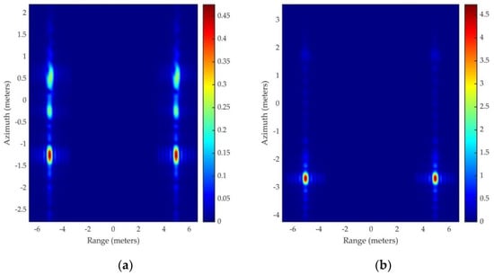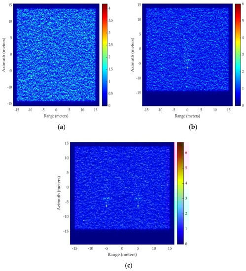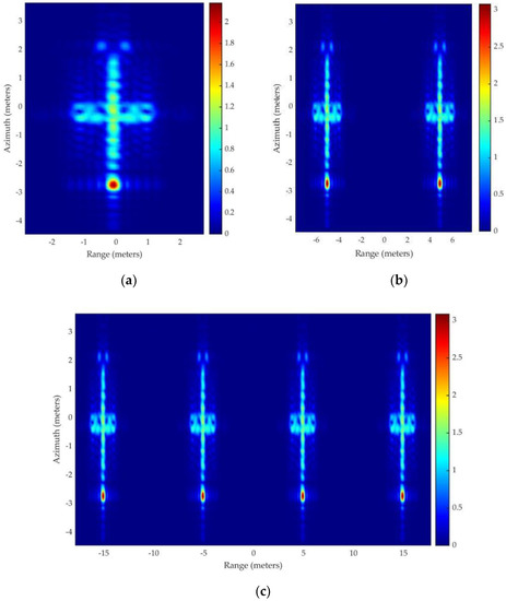 As shown in Figure 10, there is no difference in scattering intensity between the three types of location distribution. However, the target image can be identified, which can be applied to detect and recognize the targets. Meanwhile, the projection distance between two targets can be obtained. In Figure 10 b, the images have overlapping parts, because the upper target occludes the other one in the radar LOS, which is similar to the results in the HRRP analysis part. However, through the analysis of Figure 10a,b, it is unable to distinguish the missile-like targets in the free space, whether they are at the same height in a tandem array or at a different height parallel to each other. In order to distinguish the position relationship better, it needs to be analyzed in combination with the 3-D imaging results in the future research.