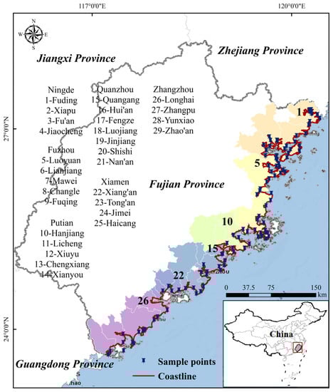 The Fujian Province is located in the southeast of China (23°33′–28°20′N and 115°50′–120°40′E), dominated by the subtropical monsoon climate. The continental coastline of the Fujian Province is very tortuous with 125 bays developed. The total land area of the Fujian province is 121,400 km2. The overall terrain is high in the northwest and low in the southeast, dominated by mountains and hills with a coverage of about 90% of the total area, leading to a dense population in the coastal area. There are six prefecture-level cities with a total of 29 counties in the coastal zone of the Fujian province (Figure 1). The coastal areas support nearly 80% of the population and produce 82.85% of the economy of the Fujian province. Fujian not only has a vast offshore fishing ground but also has plenty of tidal flats for breeding a variety of seafood, with a fishery output value of CNY 136.17 billion in 2021 []. Since the reform and opening up, the population in coastal areas of Fujian Province has increased, the economy has developed rapidly, and the rate of urbanization in Fujian’s coastal zone accelerated. A total of 29 counties along with Fujian’s coastline were selected as the scope of this study to quantify the impacts of urbanization on the changes in coastline (Figure 1).