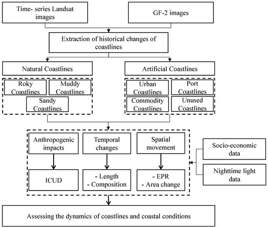 Since the first launch of the earth observation satellite in the 1970s, many studies have made great efforts in the quantitative analysis of spatiotemporal changes in coastlines using remote sensing images. Boak and Turner made a detailed description of coastline types from the perspective of RS, which provided a scientific standard for coastline research []. Based on the high-frequent revisiting period and nearly half-century historical records, remote sensing images are able to delineate the spatiotemporal changes of coastlines in detail. Li et al. used the images obtained by different RS satellite sensors to track the changes in the coastline of the Pearl River Estuary from 1980 to 2003 []. Gao et al. conducted a long-term temporal and spatial change analysis of the continental coastlines of the Chinese mainland in combination with time series Landsat images and the digital shoreline analysis system (DSAS) []. Due to more and more effects of human activities in different forms, many studies began to explore the influences of the anthropogenic stressors on coastline changes. On one hand, the dynamics of coastlines can be used as a direct indicator to show the seaward movement of human activities in coastal zones, such as land reclamation for ports, aquaculture, and industry [,]. On the other hand, many works were conducted to assess the impacts of human activities on coastline changes quantitatively. Zhang et al. used the ratio of area change caused by coastline utilization to quantify the intensity of coastline development []. In addition, the index of coastal utilization degree (ICUD) was used to quantify the contributions of land uses to coastline changes by human activities []. However, previous studies paid less attention to how the coastline changed with local economic development and issued policies. With the increasing complexity of human activities in coastal zones, therefore, an assessment framework is required to evaluate the dynamics of coastlines and to reflect the conditions of coastal zones in space and time.