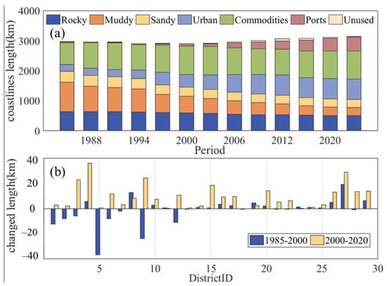 (a) Historical changes of length and composition of coastline in Fujian province; (b) Changes in length of coastline in 29 counties during two periods.