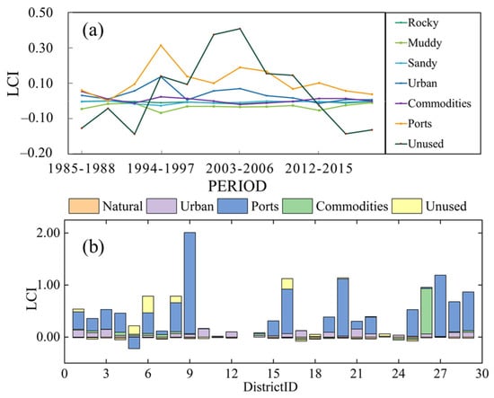 (a) LCI of all types of coastlines every three years from 1985 to 2020; (b) LCI of different coastlines in each district from 1985 to 2020.
