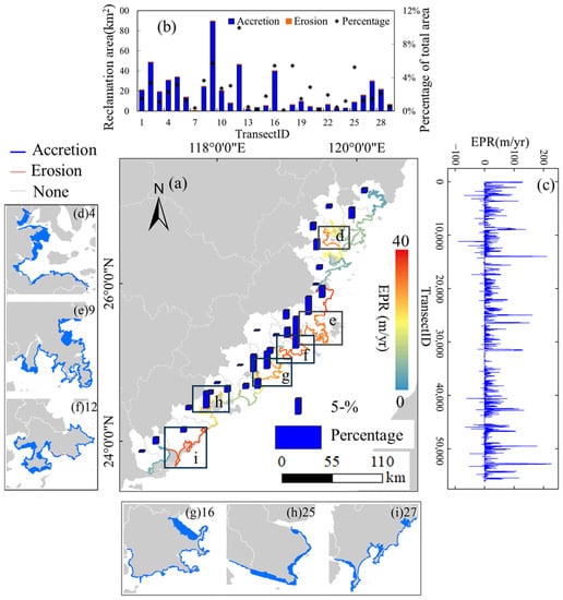 (a) EPR and the proportion of reclamation area in different districts; (b) reclamation area including accretion and erosion of each district; (c) EPR of the continental coastline of every transect; (d–i) Jiaocheng, Fuqing, Xiuyu, Hui’an, Haicang, Zhangpu Districts with huge dynamic change of EPR and reclamation area in different cities.