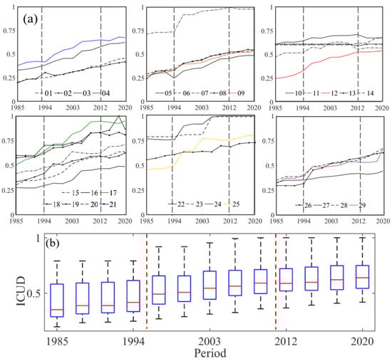(a) The changing trend of ICUD in 29 counties; (b) Some basic statistical indicators of all ICUD in 13 different periods.