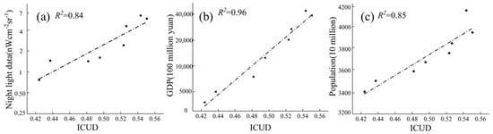The relationship between ICUD and (a) night light data; (b) GDP; (c) population at the provincial level.