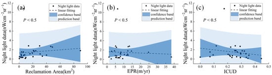 The relationship between night light data and (a) reclamation area, (b) EPR, (c) ICUD at the county level.