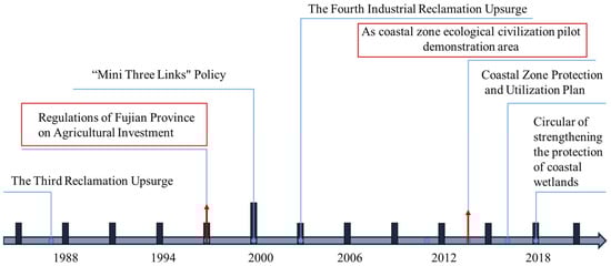 The promulgation of policies is the guideline for local economic development from the central government in the coastal zone of China. The issuing time of policies often becomes a critical tipping point for the pattern of economic development in a specified period. Over the past period from 1985 to 2020, many policies from central or local governments were implemented in Fujian’s coastal zone (Figure 9), leading to various development patterns of coastal zones indicated by changes in coastlines. In general, the total length of coastlines decreased from 1985 to 2000 and then increased from 2000 to 2020 since the different patterns of economic development (Figure 3b). From the late 1980s to the early 1990s, China set off the third reclamation upsurge focusing on aquaculture reclamation [], and the commodities coastline continually increased (Figure 3). However, the total length of the continental coastlines was reduced due to the simple geometric structure of commodity coastlines from 1985 to 1997 (Figure 3a). With the implementation of the Regulations of Fujian Province on Agricultural Investment in 1997 [], the local government paid more attention to industrial investment than agriculture since Fujian has finished the initial development in agriculture and aquaculture. Therefore, the length of the continental coastline of the Fujian Province continuously increased with the rapid development of artificial coastlines (Figure 3a) and ICUD also increased significantly, reaching the highest change intensity over the past 35 years (Figure 6b). The issue of the “Mini Three Links” policy in 2000 [] has witnessed the Fujian Province gradually becoming an important trade port along the southeast coast of China with the increasing proportion of port coastlines, which led to the increment of the total length of coastlines indicated the complicated geometry of the port coastlines (Figure 4a). “The outline of putting forward the National Marine Economy Development Plan” [] was issued in 2003, with a strategic goal of gradually building China into a marine power for the first time with the fourth upsurge of industrial reclamation. The development of artificial coastlines (i.e., port coastlines and urban coastlines) resulted in a significant increment in the continental coastlines (Figure 4b). With the ecological civilization construction adopted as a national strategy in 2014 and the Fujian Province was selected as a pilot demonstration of ecological civilization [], the pattern of coastal development changed, which was indicated by the LCI and ICUD of coastlines (Figure 4 and Figure 6a). In 2016, the Fujian Provincial Department of Oceans and Fisheries issued the Coastal Zone Protection and Utilization Plan of Fujian Province [], aiming to further optimize land space and strengthen coastal ecosystem protection, Figure 4a shows that the LCI of each type of coastline has decreased to less than 10%. The State of Council issued “the circular on strengthening the protection of coastal wetlands and strictly controlling reclamation” in 2018 []. All reclamation projects are strictly prohibited, and most natural coastlines are protected, leading to nearly no changes in coastlines from 2018 to 2020 (Figure 3).