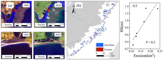 (a) Erosion and accretion of coastlines from 1985–2020; (b) The overview of Erosion of reclamation in continental coastlines of Fujian for 35years. (c) The relationship between erosion areas and local significant wave height.