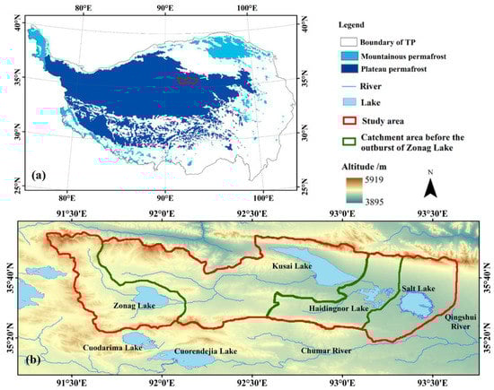 Overview of the study area: (a) the permafrost on the TP; (b) the topography and lake distribution of the study area.