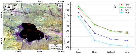 Comparison of several water body indices around Zonag Lake: (a) Selection of different features and (b) comparison of different water index.
