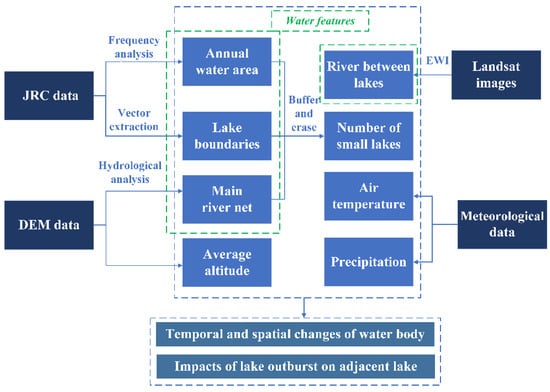 Flowchart of the acquisition of water body changes and impacts of lake outburst on adjacent lake on ZSLB.