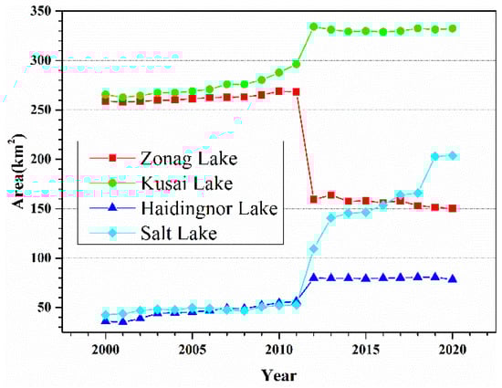 Areas of four lakes in ZSLB between 2000 and 2020.