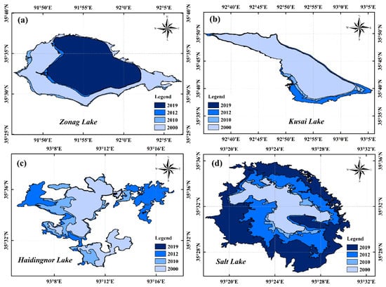 Changes in shorelines in 2000, 2010, 2012 and 2019 of the (a) Zoang Lake; (b) Kusai Lake; (c) Haidingnor Lake and (d) Salt Lake.