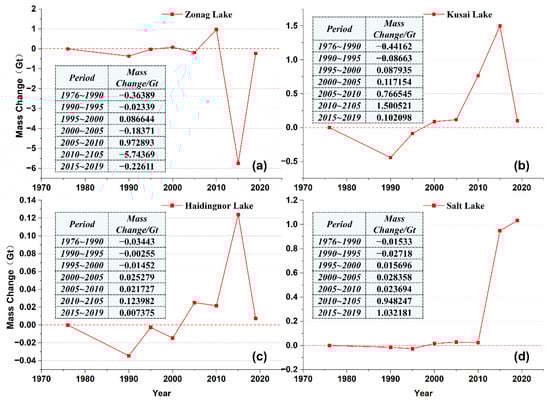 Mass changes of (a) Zonag Lake; (b) Kusai Lake; (c) Haidingnor Lake; and (d) Salt Lake between 1976 and 2019.
