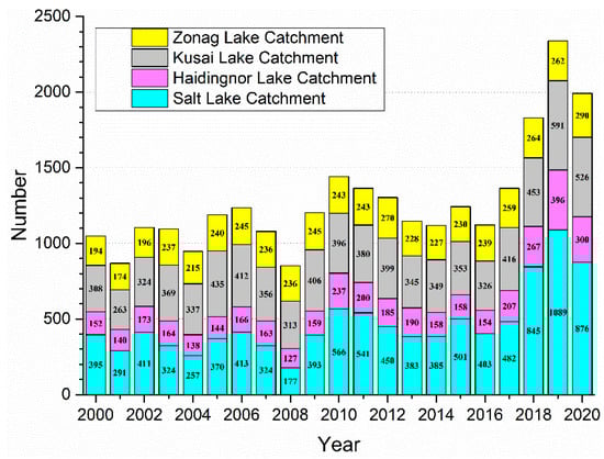 Considering the changes of small lakes and ponds within each catchment of the four lakes individually, the number of small lakes and ponds within each catchment of the four lakes fluctuated and increased during the decade from 2000 to 2010. In the catchment of Haidingnor Lake, the number of small lakes and ponds decreased by about 16% from 2000 to 2008, but nearly doubled between 2008 and 2010, reaching 237. Within two years of the outburst of the Zonag Lake in 2011, the number of small lakes and ponds within the catchment first jumped to 270 and then gradually decreased. However, the number of small lakes and ponds rose again after 2016, with an increase of about 19%, reaching 290 in 2020. The number of small lakes and ponds in the former Kusai Lake basin and Haidingnor Lake basin underwent an increase–decrease–increase cycle after 2011, eventually reaching 1.45 and 1.67 times the number of lakes and ponds in 2010, respectively. The number of small lakes and ponds in the Salt Lake catchment increased significantly after 2016, and finally reached 876 lakes and ponds in 2020, which was 1.5 times the number of lakes and ponds in 2010. This is the largest increase in the number of small lakes and ponds among the four catchments (Figure 10).