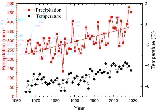 The air temperature and precipitation data since 1965 were collected from Wudaoliang meteorological observation station (35.21°N, 93.08°E, 4612 m a.s.l), which is the nearest national station to the study region. The data were downloaded from China Meteorological Administration (CMA) (http://cdc.cma.gov.cn, accessed on 27 October 2020).