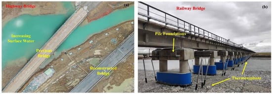 From an engineering viewpoint, the bearing capacity and deformation behavior of permafrost subgrade are closely related to its thermal regime. As an excellent heat carrier, the surface water can bring a large amount of heat and cause rapid deepening of the active layer, warming of permafrost layer and even development of taliks. These processes will lead to a decrease in the bearing capacity of permafrost subgrade and an increase in (differential) thaw settlement of foundation built on permafrost. Based on in situ monitoring, Mu. et al. [] concluded that water ponds near the foot of a railway embankment can significantly affect the thermal regime of permafrost subgrade and cause excessive settlement of the railway embankment. Lin et al. [] and Wen et al. [] investigated impacts of thermokarst lakes near the roadway embankment through numerical simulations. The simulated results showed that the thermokarst lakes can result in local permafrost warming and thawing beneath the roadway embankment. Compared with water ponds or a thermokarst lake, surface water flow would lead to more rapid and severe permafrost warming and thawing due to convection heat transfer between the flowing water and shallow ground.