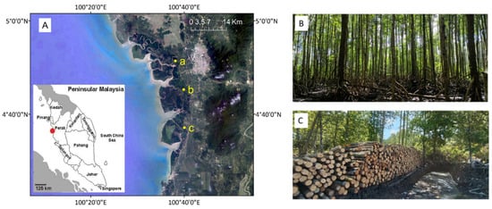 The Matang Mangrove Forest Reserve (hereafter referred to as MMFR), located on the west coast of peninsular Malaysia, is well-known for its silvicultural management that started more than a century ago [] (Figure 1). The forest, which is predominantly composed of Rhizophora apiculata Blume and R. mucronata Lam., is managed under a thirty-year rotation cycle that includes two intermediate thinnings at the forest age of 15 and 20 years for pole production and a final clear-felling at the age of 30 years for charcoal production []. Every 10 years, a new management plan is released to set the number of pole and charcoal contractors who are granted an annual license for forest exploitation. The MMFR mangroves are not only important for their ecological value, but also because they are economically supporting a wide range of local stakeholders (from tree cutters, boat drivers, and fire monitors to charcoal factory owners, export companies, etc.) [,].