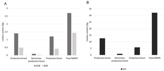Considering the total areas occupied by different forest zones (productive, restrictive productive, and protective), the total C stock for the MMFR (AGB, BGB, and soil combined) would be equal to 23,038,322.9 Mg C.