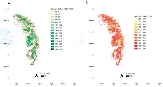 Regarding the vegetation biomass, remote sensing data are a valuable source for biomass estimations in mangroves and can provide a very detailed view of an area over time [,]. Furthermore, we integrated data from field measurements [,] with the age maps obtained through remote sensing [], producing for the first time an accurate representation of the carbon storage in the entire MMFR that includes not only vegetation but also the belowground component (i.e., roots and soil).