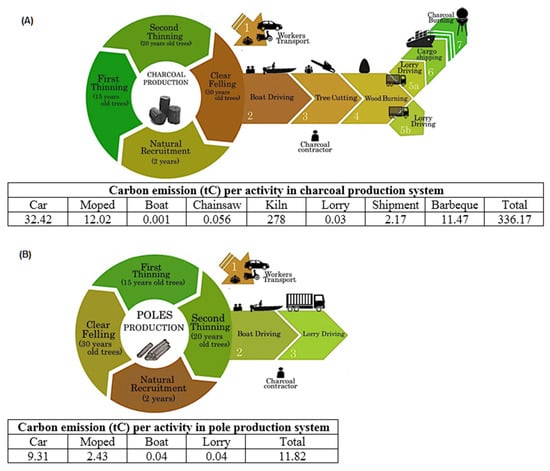 (A) Mangrove charcoal and, (B) pole production activities with their carbon emission values (Mg C) at Matang Mangrove Forest Reserve (tables). The emissions were calculated based on the licenced area assigned to one contractor. Continued arrows show direct activities, while discontinued show indirect activities in each production system. Carbon sources are numbered in order of occurrence (adapted from Satyanarayana et al. []).