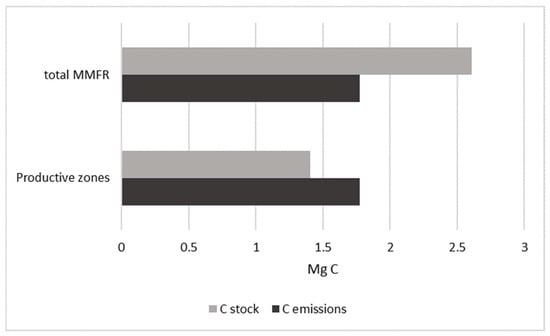The comparison between carbon emissions and carbon stock was possible because we considered the emissions for a rotation cycle of 30 years based on the area information provided by the latest management plan [] and we compared it with the carbon stock accumulated in the productive areas over 30 years.